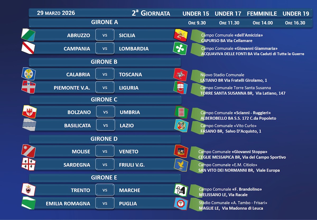 Si chiude con 99 gol la prima giornata della fase a gironi del Torneo delle Regioni, al via oggi in Puglia. Il Lazio è l’unica delle venti partecipanti ad aver trionfato in tutte e quattro le categorie (Juniores, Allievi, Giovanissimi e Femminile), seguono a tre successi Emilia-Romagna, Toscana e Veneto. Domani si torna subito in campo per la seconda giornata: alle ore 9.30 gli Under 15, alle 11.30 gli Under 17, alle 14 le formazioni nel Femminile e alle 16.30 chiudono gli Under 19.